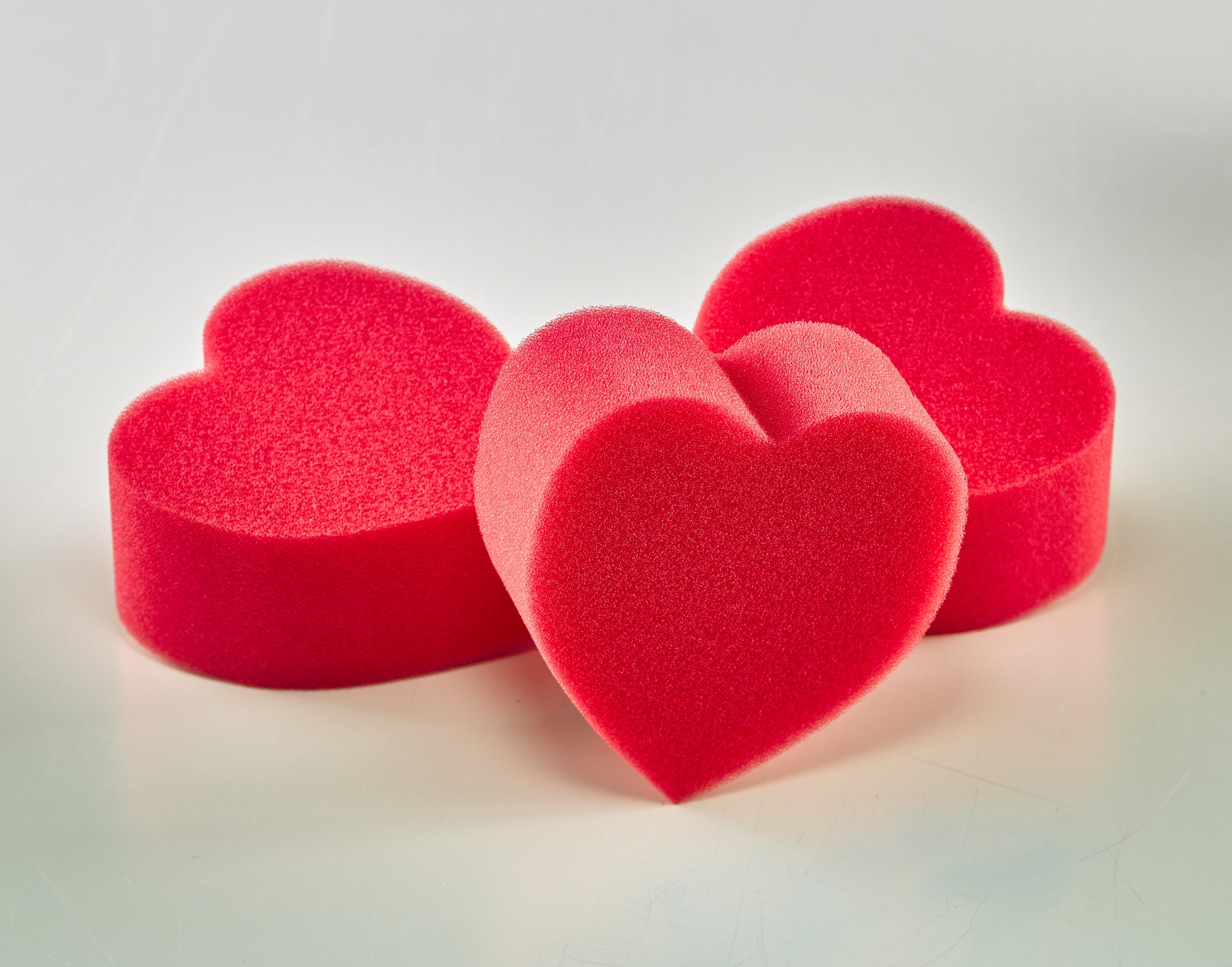 Fine-pored, soft, heart-shaped universal make-up sponge made of foam.